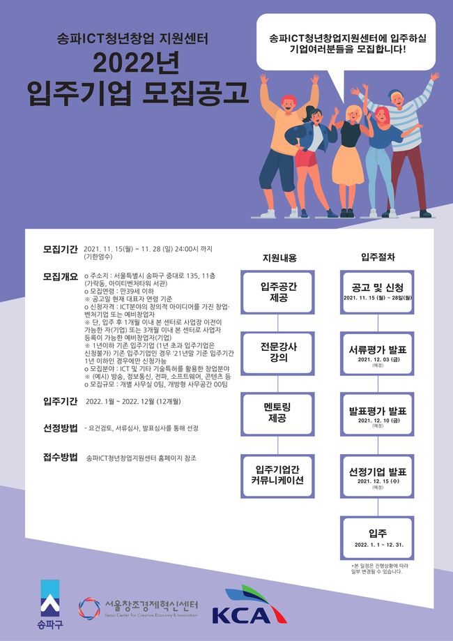 송파구가 ‘송파ICT청년창업지원센터’에 새롭게 입주할 유망한 (예비)청년창업가를 오는 11월 28일(일)까지 공개 모집한다고 밝혔다.