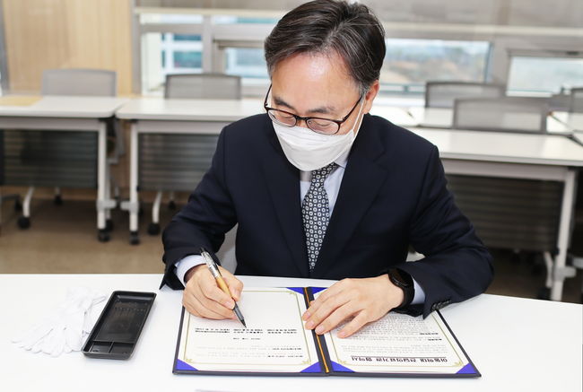 유성훈 금천구청장이 아동학대 전담의료기관 협약서에 서명을 하고 있다