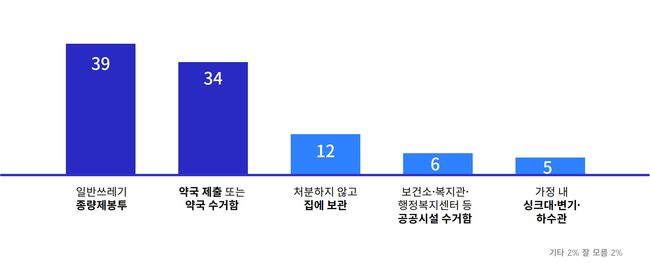 폐의약품 처리를 어떻게 하고 있는지에 대한 질문에는 ‘약국 제출 또는 약국 수거함’(34%), ‘보건소 등 공공시설 수거함’(6%) 등 전체 응답자의 40%만이 올바르게 처리하는 것으로 나타났다. 나머지는 ▲일반쓰레기 종량제봉투(39%) ▲처분하지 않고 집에 보관(12%) ▲가정 내 싱크대․변기․하수관(5%) 등이다.