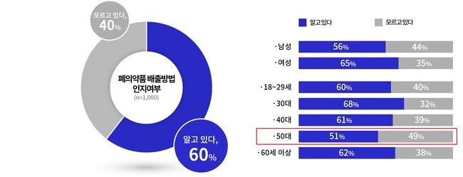 경기도는 11월 11일부터 12일까지 도민 1,000명을 대상으로 한 ‘폐의약품 처리’ 관련 여론조사 결과, 폐의약품을 버리는 방법에 대해 알고 있는지에 대해 40%가 ‘모르고 있다’고 답했다고 24일 밝혔다. 연령대별로는 50대가 49%로 가장 높은 반면, 30대가 32%로 가장 낮게 나왔다.