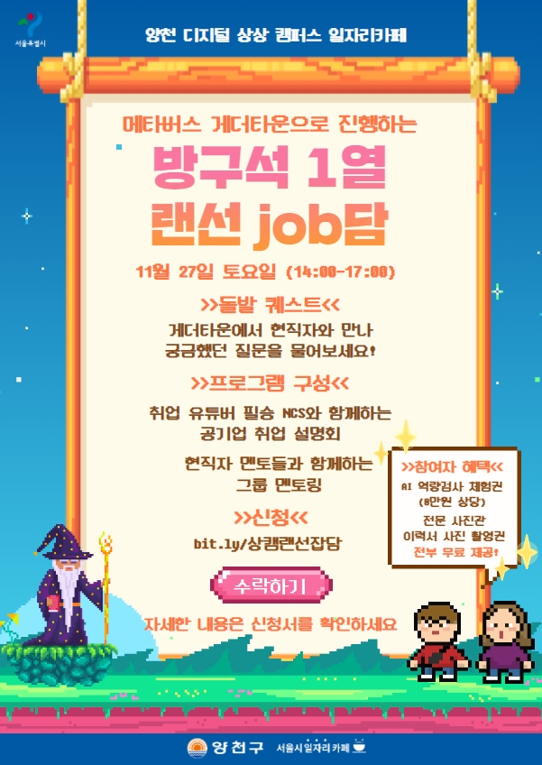 양천구가 오는 11월 27일 청년 구직자를 대상으로 메타버스 플랫폼(게더타운)을 활용한 취업콘서트 ‘방구석 1열 랜선 job담’을 진행한다고 밝혔다.