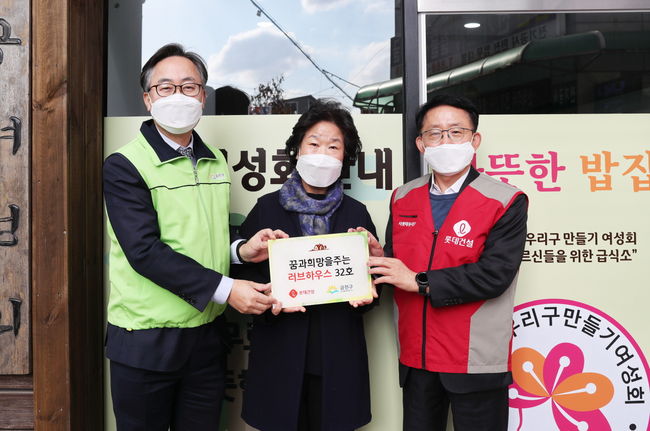 11월 23일(화) `살구여성회 따뜻한 밥집` 시설개선 기념 현판식 중 유성훈 금천구청장(사진 왼쪽)이 박양희 센터장(사진 가운데), 롯데건설 하석주 대표이사와 함께 기념촬영을 하고 있다.