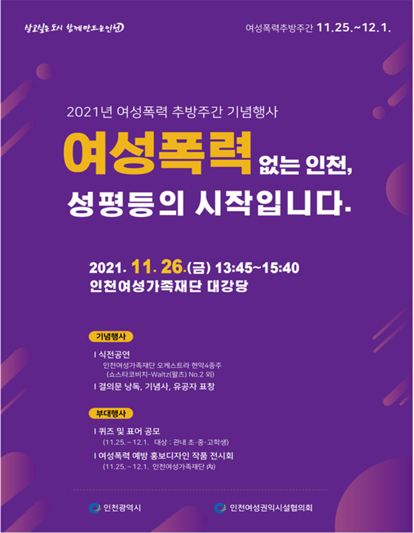 인천광역시는 2021년도 여성폭력 추방주간(11.25.~12.1.)을 맞아, ‘여성폭력 없는 인천, 성 평등의 시작입니다’를 주제로 기념행사를 진행했다고 밝혔다. 기념식은 26일 오후 2시 인천여성가족재단 대강당에서 진행됐다.