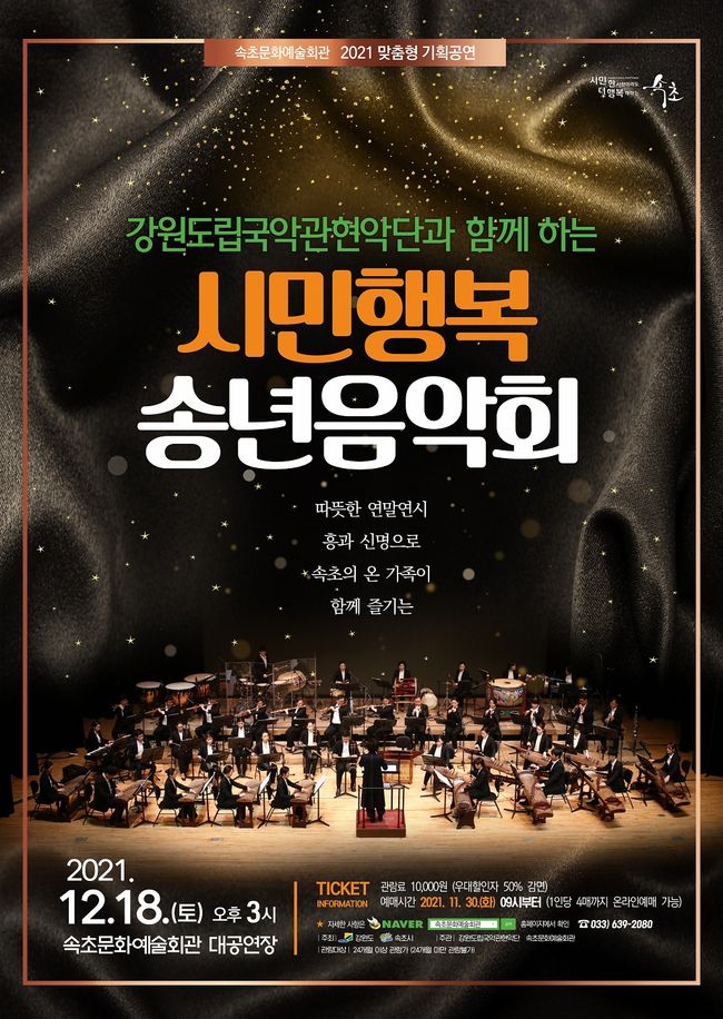 속초시가 올해 마지막 기획공연으로 강원도립국악관현 악단과 함께 하는 `시민행복 송년음악회`를 12월 18일 토요일 오후 3시 속초문화예술회관 대공연장에서 개최한다.