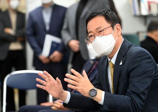 박남춘 인천광역시장 29일 시청 기자실에서 2025년 건설폐기물 수도권매립지 반입 금지와 관련한 기자간담회를 하고 있다.
