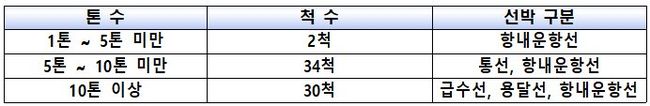 부산남항 내 톤수별 소형선박(항내운항선) 현황(총 66척) ‘소형선박 고유 식별번호’는 부산남항 내 항만허가를 받은 항내운항 소형선박을 대상으로 부여되며, 선박 조타실 양 현에 주·야간 시간대 원거리 식별이 용이한 번호판을 부착하는 것이다.