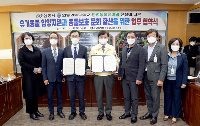 안동시는 안동과학대학교(반려동물케어과)와 유기동물 입양 지원 및 동물보호 문화 확산을 위한 업무 협약식을 11월 26일 안동시청 소통실에서 가졌다.