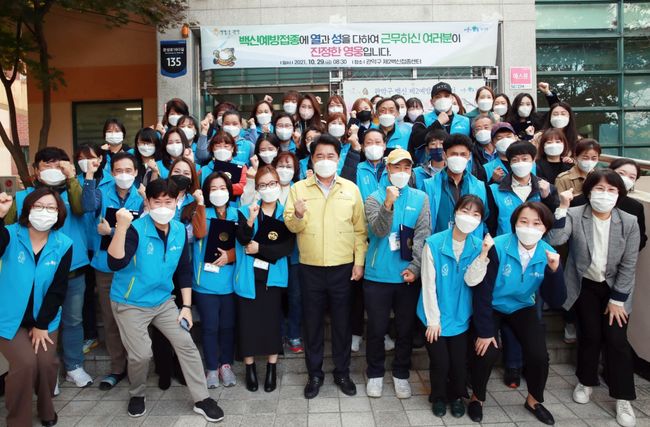 지난 10월 29일 코로나19 예방접종센터 운영 종료 후 근무인력과 박준희 구청장이 기념촬영을 하고 있다.