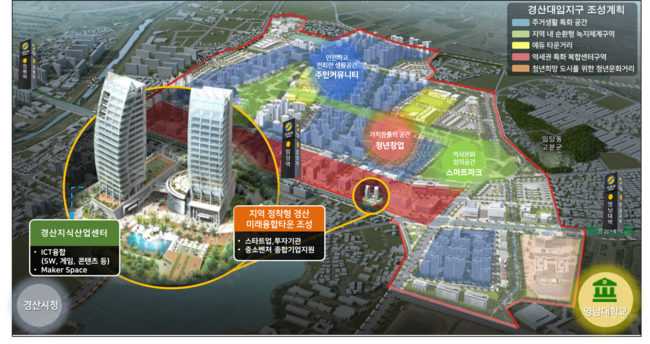 특히, 현재 진행 중인 경산지식산업센터(총 사업비 400억원)사업과 완공시기를 같이 하면서 임당역 주변지역은 대임지구(아파트단지)와 함께 청년들이 일과 휴식, 주거를 함께할 수 있는 스마트 도시로 변화될 것으로 전망하고 있다.