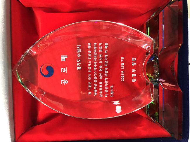 선정된 우수기관에는 공로패와 ‘공공부문 온실가스 감축목표 10년 연속 달성기관’이라는 문구가 새겨진 현판을 수여했다. 37개 기관 중 지방자치단체는 수원시를 포함해 9곳이다.