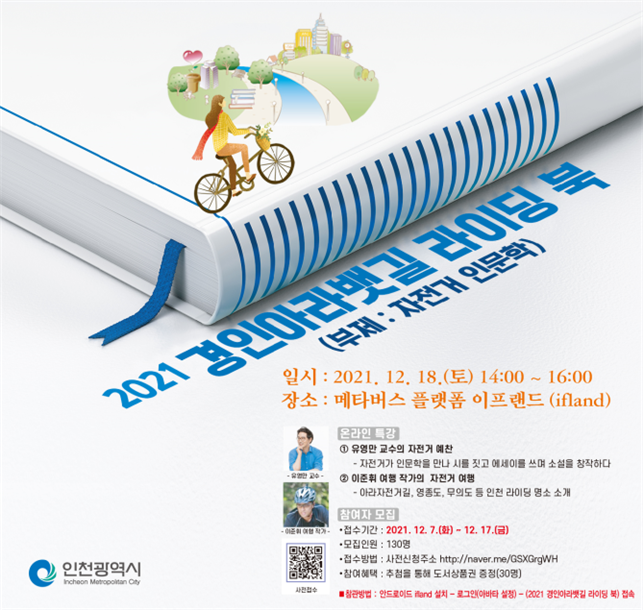 인천광역시는 경인아라뱃길 등 인천의 자연환경을 소재로 한 강연,‘경인아라뱃길 라이딩 북’을 오는 12월 18일 메타버스에서 개최한다고 밝혔다.