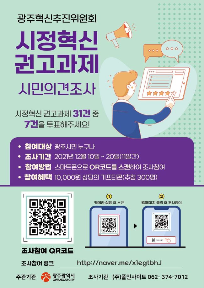 시민 의견조사는 10일부터 20일까지 진행되며, 시민의견 조사와 혁신과제를 제안한 참여자를 대상으로 300명을 추첨해 24일 경품(기프티콘)을 증정하는 이벤트도 실시한다.