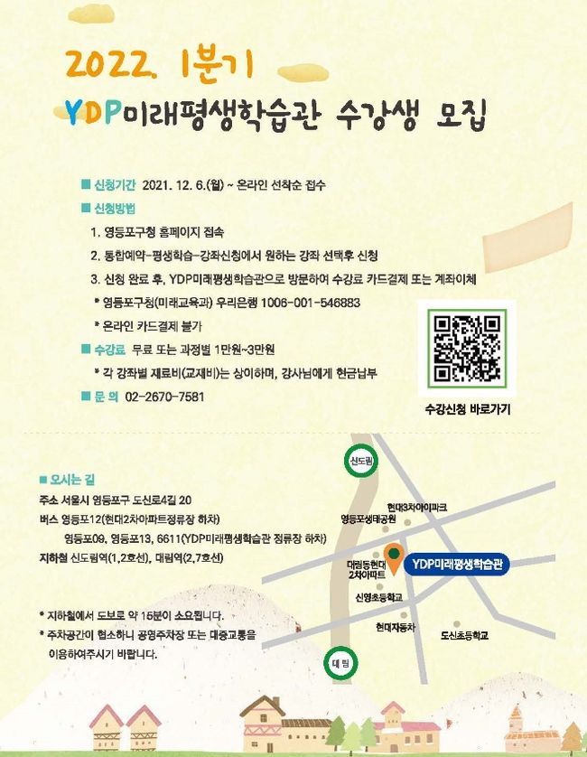 22년 1분기 강좌는 프로그램별 일정에 따라 내년 1월 10일부터 3월 31일까지 진행되며, 대림동에 위치한 YDP미래평생학습관에서의 오프라인 강좌와 온라인 수업이 병행 운영된다.