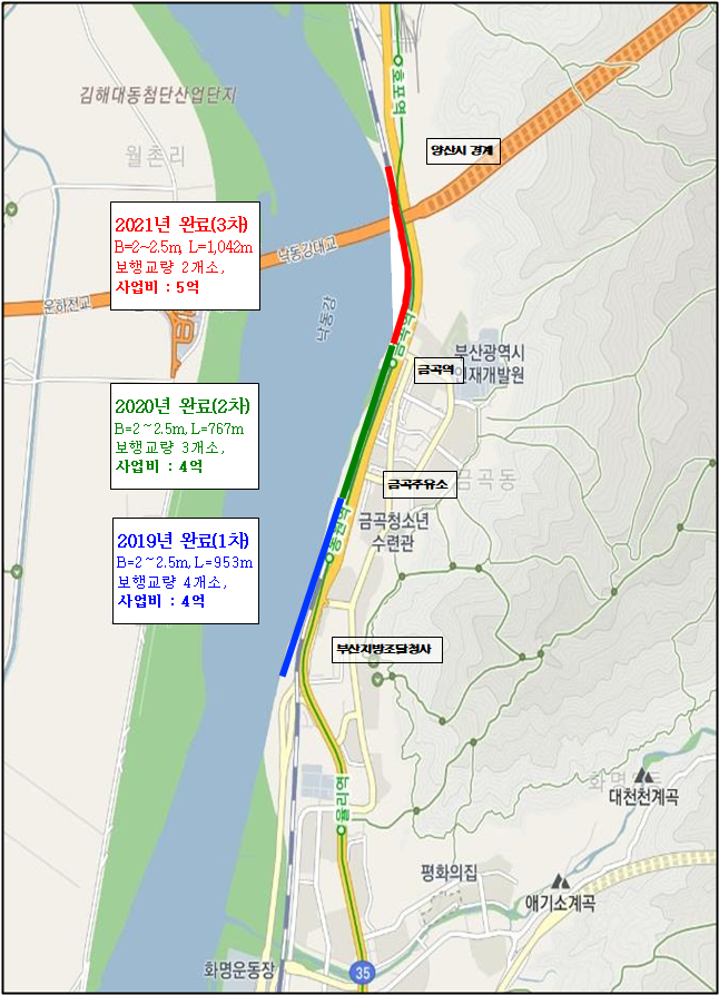 그동안 화명생태공원 금곡지역에는 낙동강살리기사업으로 조성된 국토종주 자전거도로(부산~경북 안동)밖에 없어, 자전거와 보행자가 해당 도로를 함께 이용하며 레저활동과 산책을 즐겼다. 그러나, 자전거와 보행자 간 충돌에 따른 안전사고가 빈번하게 발생함에 따라 보행환경 개선을 요구하는 민원이 지속적으로 제기되어 왔다. 이번 공사로 기존 자전거도로와 별개로 보행자 전용 탐방로가 신설돼 화명생태공원을 탐방하는 시민들에게 이용 편의와 안전한 보행환경을 제공할 수 있을 것으로 기대된다.