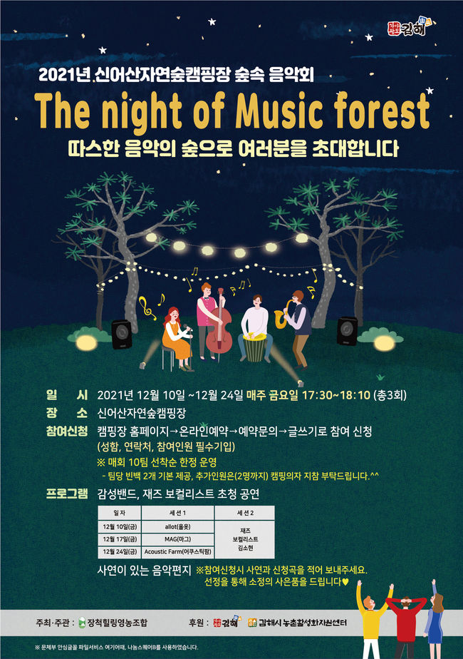 김해시 신어산 자연숲캠핑장은 지난 10일부터 오는 24일까지 매주 금요일 오후 1회씩 소규모 사전예약자를 대상으로 코로나19 방역수칙을 준수한 가운데 ‘숲속음악회-The night of Music forest’ 행사를 개최한다고 14일 밝혔다.