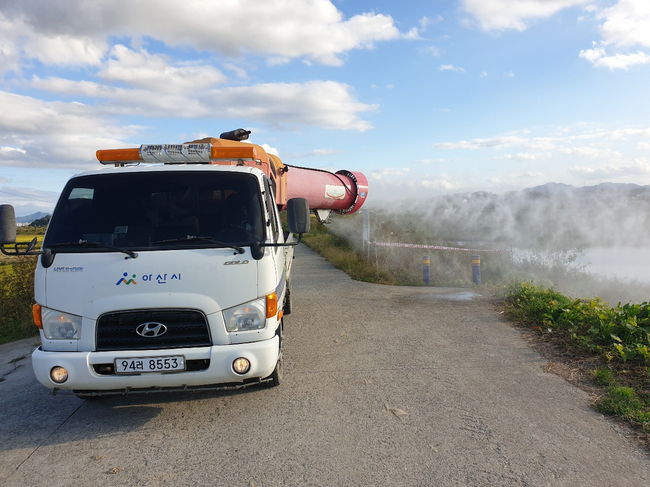 방역차량이 철새도래지를 소독하는 장면