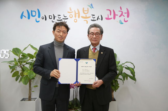 왼쪽부터 김종천 과천시장, 연안차씨종친회 차형수 회장