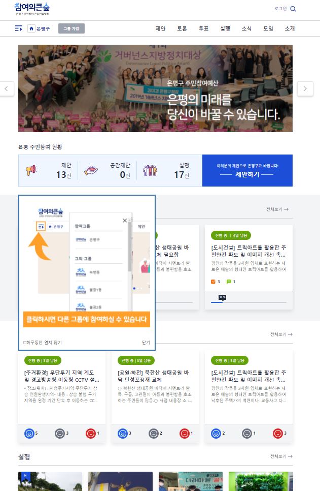 은평구는 주민참여 온라인플랫폼 ‘참여의 큰숲’을 운영한다. 코로나19와 새로운 주민들의 참여 발굴을 위한 비대면 방식의 주민 소통창구에 대한 필요성이 늘어나고, 주민참여 확대에 따른 활동의 소개 및 정보교류를 통한 쌍방향 소통을 위해 구축했다.