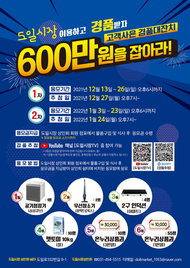 경품 행사 참여 방법은 간단하다. 기간 내 도일시장에서 물품 구매 또는 식사 후 경품 응모권을 지급받아 상인회 쉼터 응모함에 응모하고, 추첨 당일 유튜브 채널 또는 줌(ZOOM)으로 경품 추첨에 참여하면 된다.