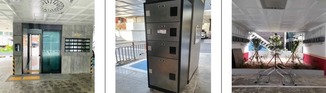 왼쪽) 주출입고 가운데)무인택배함 오른쪽) 자전거 거치대