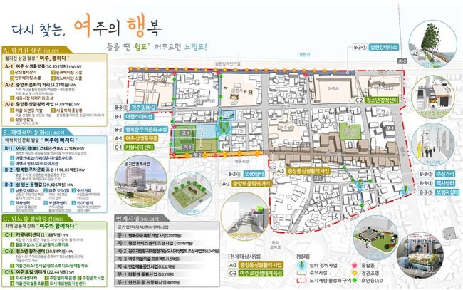 여주시 중앙동은 상생플랫폼 및 커뮤니티센터와 행복주택(120호)을 조성하고, 여행객 거점 공간인 ‘여(주)행(복) 스테이션’, 쉼 있는 동행길 등 가로환경개선사업을 추진한다.