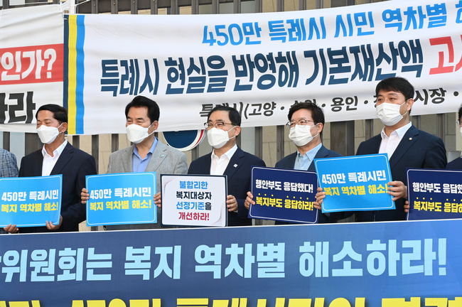 현행 제도에는 기초생활보장 대상자를 선정할 때 재산 금액을 대도시 6900만 원, 중소도시 4200만 원, 농어촌 3500만 원 등 도시 규모별로 기본재산액을 공제해준다. 인구 100만 명 이상 대도시도 ‘중소도시’에 포함돼 인구 5~10만 명 기초지자체와 동일한 기준을 적용받는다.