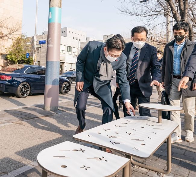 천호자전거테마거리 내 설치된 시설물을 점검하고 있는 이정훈 강동구청장