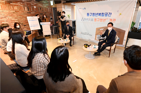 박남춘 인천광역시장이 6일 동구 유유기지에서 열린 `동구청년복합공간 유유기지 동구청년21 개관식`에서 청년들과 이야기를 나누고 있다.