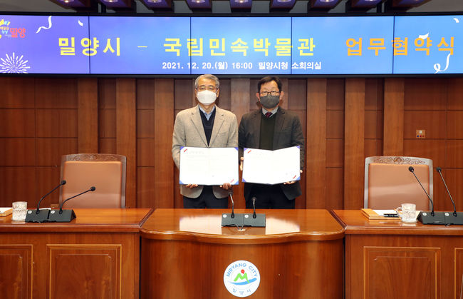 밀양시는 20일 시청 소회의실에서 국립민속박물관과 지역 민속 활성화 및 학술 분야 교류 협력, 지역 박물관 운영과 신규 건립 협력 등을 위한 업무협약을 진행했다.