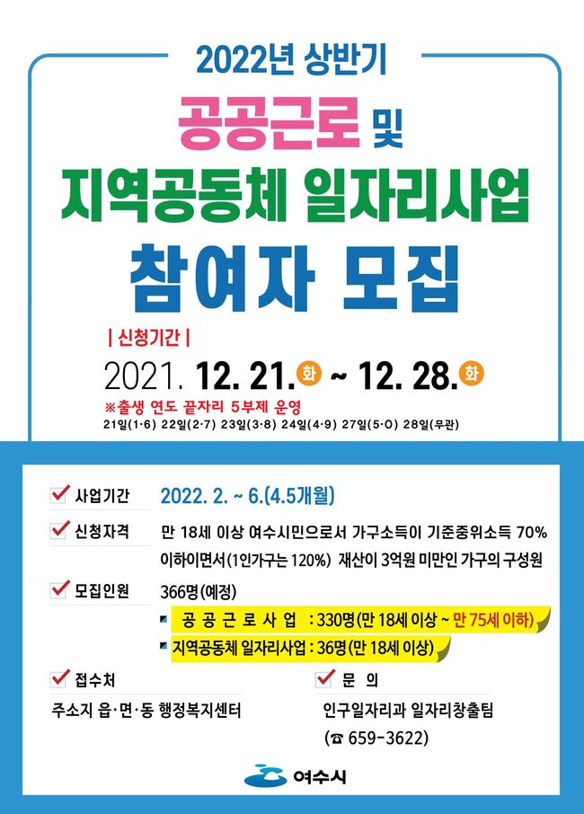 여수시가 코로나19로 인한 위기극복을 위해 2022년 상반기 공공근로 및 지역공동체일자리사업 참여자 366명을 모집한다.