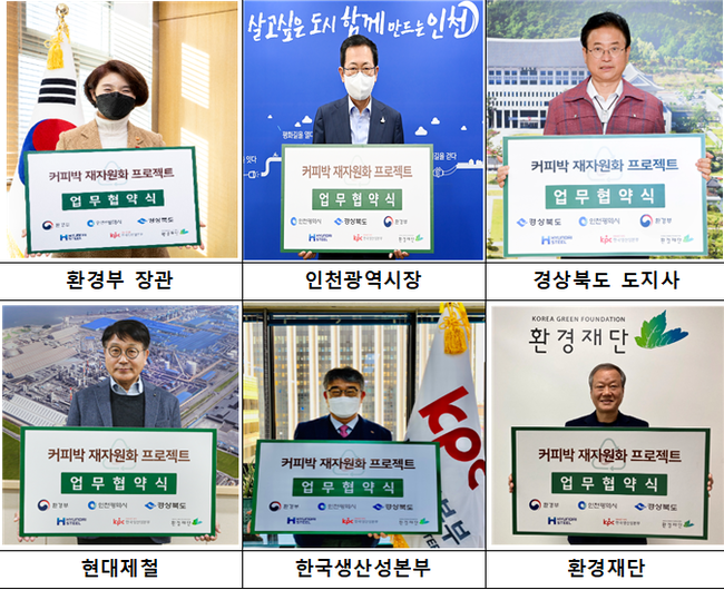 인천광역시는 22일 환경부, 경상북도, 현대제철, 한국생산성본부, 환경재단과 함께 커피박을 재자원화 하는 친환경 자원순환 모델 구축을 위한 업무협약을 체결했다고 밝혔다.