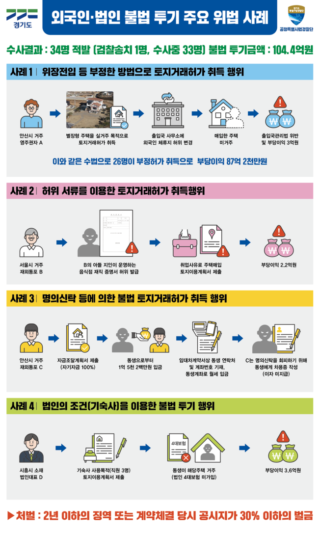 토지거래허가 구역 내에서 위장전입, 명의신탁 등 부정한 방법으로 104억 원 규모의 불법 투기행위를 벌인 재중동포 등 외국인과 법인 34명이 경기도 특사경에 적발됐다.