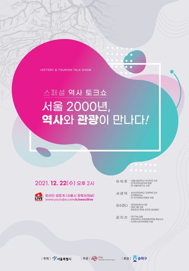 ‘서울 2000년, 역사와 관광이 만나다’는 송파구의 한성백제 역사문화자원을 관광자원으로 보다 활성화할 방안 등을 주제로 한 온라인 토크쇼로, 이익주 서울시립대 교수, 서경덕 성신여대 교수 등이 발표자와 패널로 참여했다.