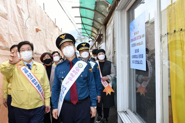 염태영 시장과 김원준 경기남부경찰청장이 4월 20일 수원역 성매매집결지를 함께 점검하고 있다.