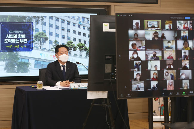 장덕천 부천시장이 화상회의 방식으로 2022 온라인 시정설명회를 진행하고 있다.