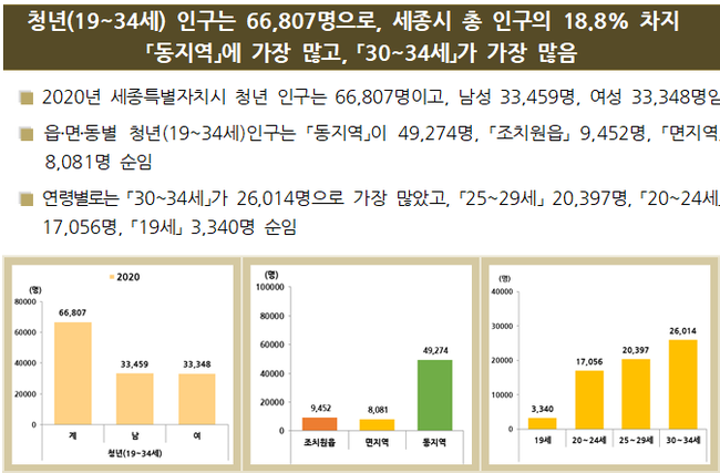 2020년 12월 말 기준 만 19세 이상 34세 미만의 지역 청년은 전체의 18.8%에 달하는 6만 6,807명으로 조사됐다. 성별은 남성이 3만 3,459명, 여성이 3만 3,348명이었다.
