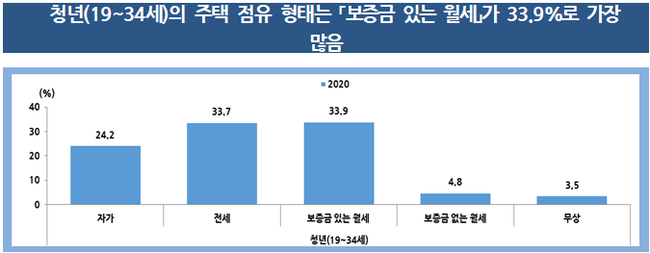 지역 청년의 주택점유형태는 보증금 있는 월세가 33.9%로 가장 많았고, 전세 33.7%, 자가 24.2% 순이었다. 연령별로 세분화해보면 19세부터 34세까지 나이가 들수록 전세 비율이 높아졌다.