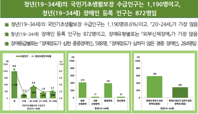 지역 청년 중 국민기초생활보장 수급자는 1,190명(1.8%), 장애인 등록 인구는 872명(1.3%)이었다. 공적연금 가입자는 국민연금 3만 1,128명(46.6%), 공무원연금 8,797명(13.2%), 사학연금 328명(0.5%) 순이었다.