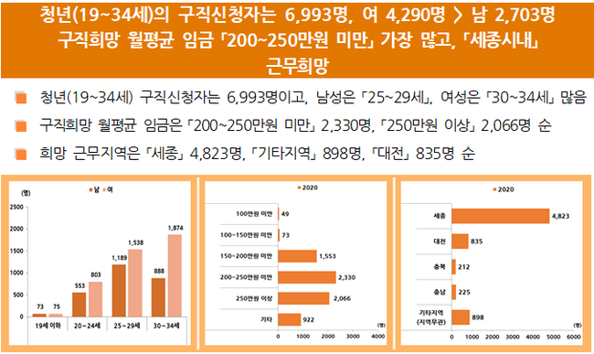지역 청년 중 구직신청자는 6,993명(10.5%)이었고, 희망하는 월평균임금은 200만~250만 원이 2,330명, 250만 원 이상 2,066명, 150만~200만 원 1,553명 순이었다.