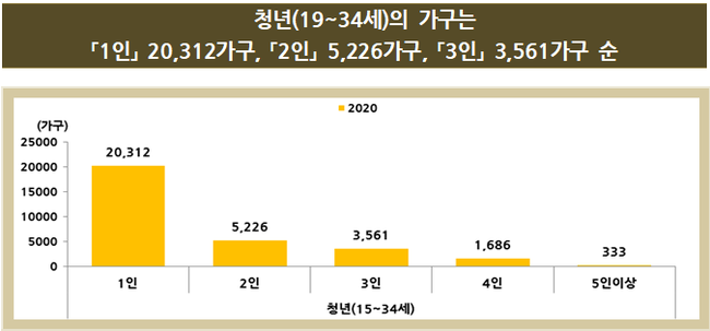 청년 가구원수는 1인 2만 312가구, 2인 5,226가구, 3인 3,561가구 순으로 1인 가구의 비율이 압도적으로 높았다. 또 세종으로 전입한 청년의 수에서 전출한 인원을 뺀 순이동은 4,089명으로 파악됐다.