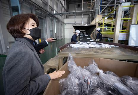 한정애 환경부 장관은 28일 시화호 조력발전소를 방문해 재생에너지 발전현황 등을 점검했다. 사진은 지난 23일 `환경부-이차전지 재활용업계 간담회` 참석 당시 (사진=환경부)