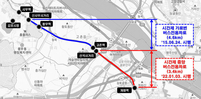 김포시는 내년 1월 3일부터 신곡사거리에서 개화역까지 시간제 중앙버스전용차로를 시행한다고 밝혔다.