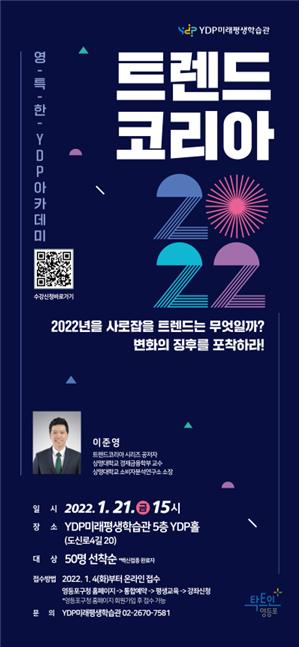 영등포구는 YDP미래평생학습관의 다양한 평생학습 프로그램을 선보이고 지역 주민의 사회‧인문학적 소양을 높이기 위한 명사특강 ‘YDP 영.특.한 아카데미’를 오는 1월 21일 개최한다고 밝혔다.