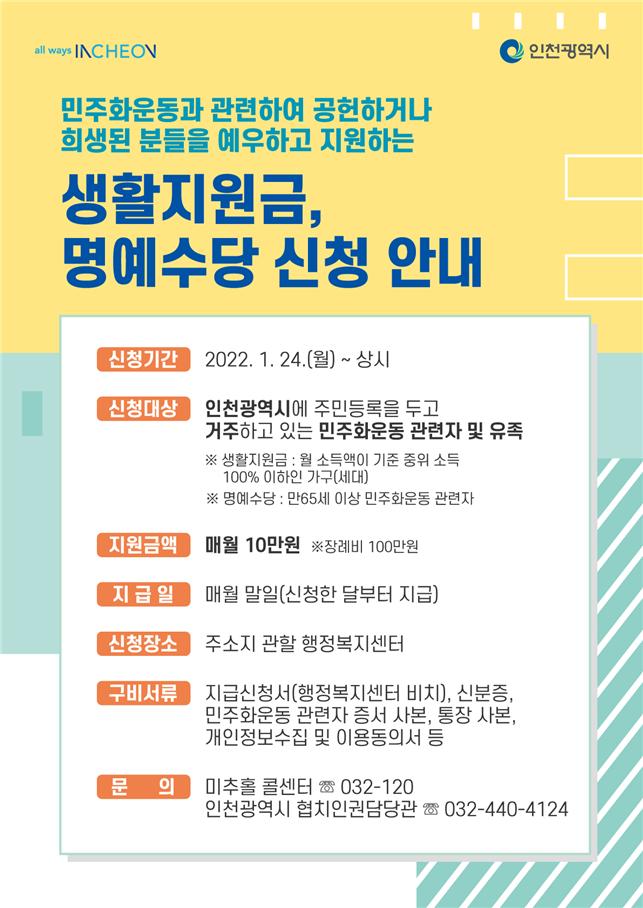 인천광역시는 지역에 거주하는 민주화운동 관련자와 유족에게 매월 10만원의‘생활지원금’또는‘명예수당’을 올해 1월부터 지급한다고 밝혔다. 또한, 민주화운동 관련자가 사망했을 시에는 장례비 100만원을 지급한다.