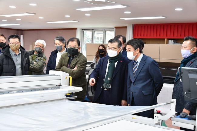 지난해 12월 공용장비실을 방문해 자동재단 작업 시연 모습을 확인하고 봉제인들의 애로사항을 청취하는 류경기 중랑구청장