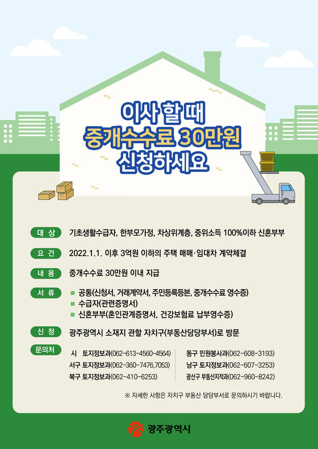 광주광역시는 올해부터 주거취약계층의 주거 안정을 위해 중개수수료 30만원을 지원한다.