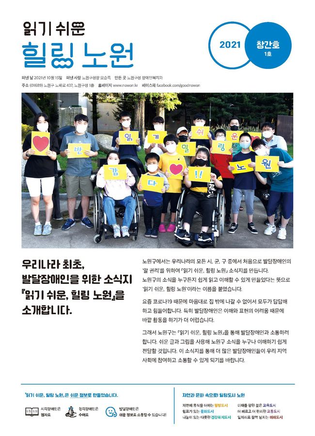 한편 구는 지난해 10월 서울시 자치구 최초로 발달장애인을 위한 구정 소식지 「읽기 쉬운, 힐링 노원」을 발간했다. 기존의 구정 소식지를 발달장애인이 쉽게 이해할 수 있는 언어와 그림을 이용해 제작한 소식지는 올해부터 발달장애인을 둔 부모들이 시민기자로 소식지 제작에 참여하는 등 콘텐츠를 다양화한다. 읽기 쉬운 소식지는 장애인활동지원 제공기관을 통해 발달장애인 가정에 배포하고, 지역 내 54개소 장애인기관과 공공기관에 비치해 장애인과 비장애인 간 이해의 폭을 넓히는 데 기여하고 있다.
