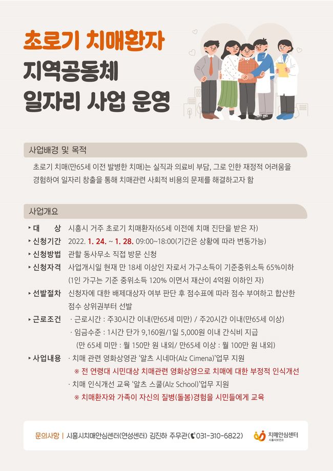 참여 대상은 시흥시에 거주하는 초로기 치매환자로, 만 65세 이전에 치매 진단 또는 경도인지장애 진단을 받은 환자이다. 사업에 참여하게 되면, 치매관련 영화상영관 ‘알츠 시네마’와 치매인식개선 교육 ‘알츠 스쿨’ 업무를 지원하게 된다.