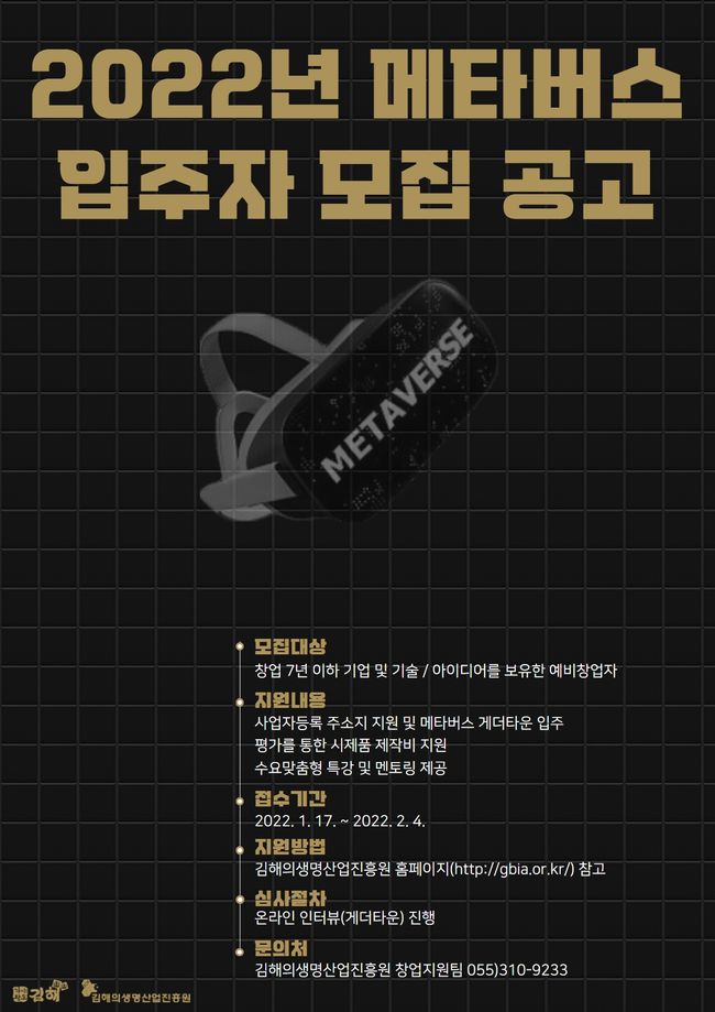 김해시·김해의생명산업진흥원(이하 ‘진흥원’)은 우수한 기술과 참신한 아이디어를 가진 예비창업자와 7년 이내 초기 기업을 대상으로 메타버스 입주자를 모집한다고 밝혔다.