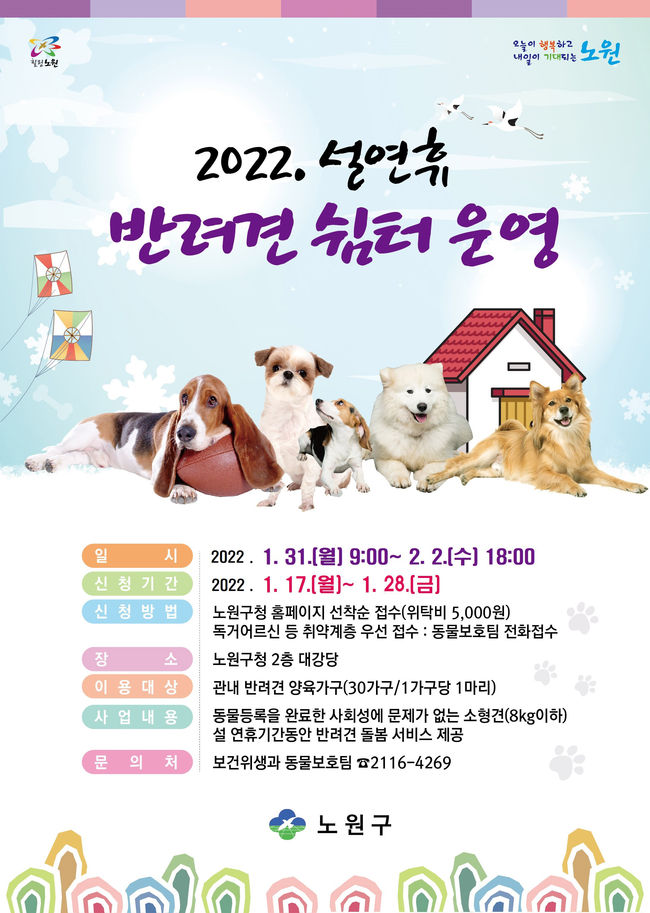 서울 노원구가 설 연휴 귀성을 계획하고 있는 구민들을 위해 반려견 쉼터를 운영한다고 밝혔다.